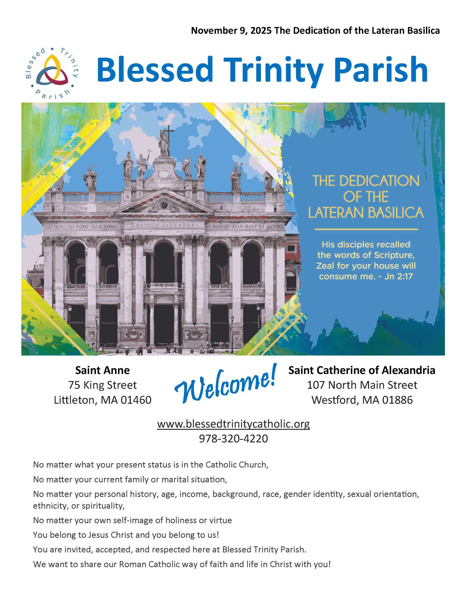 On this Feast of the Dedication of the Lateran Basilica, celebrated by our universal church, let us pray for our own Blessed Trinity Parish, our Archdiocese of Boston. all dioceses, churches, and sacred places around the world, that they be places where all encounter the Risen Christ. We pray for Pope Leo XIV in a particular way today, that in the Lateran Basilica, he may encounter Father, Son, and Holy Spirit. Amen